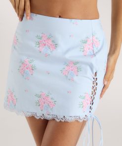 Full cotton lining Side slit with adjustable lace-up feature Guipure edge to hem Invisible zip fastening to side Silver tab to centre-back with logo engraving Part of ‘Sophia u0026amp; Cinzia for Lounge’ |Your favourite brand just launched a collection with your favourite influencers. Step into Sophia u0026 Cinzia’s world of floral patterns and pastel hues. Meet feminine designs that flatter the figure with this curation of corset tops and matching sets that you’ll adore. u003cbru003e The Celia Mini Skirt is a masterpiece in blue. Inspired by our decade-long mastery of contour and corsetry, this skirt fits like a dream.