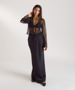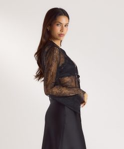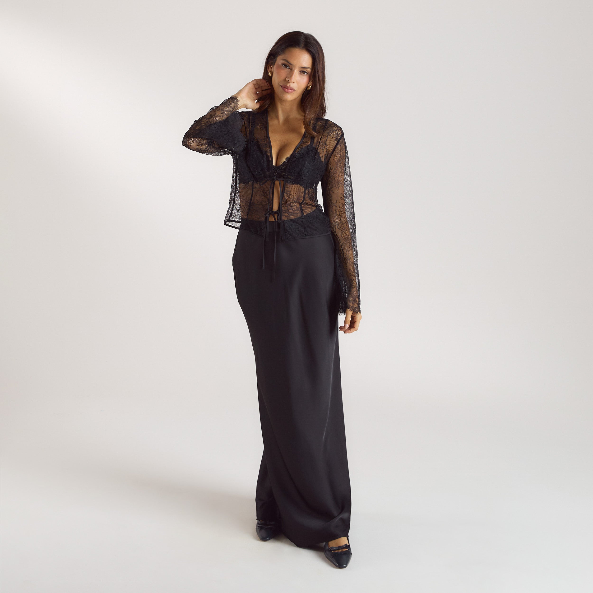 2 tie fastenings to front Long sleeves with slight fluting Eyelash lace finish to sleeve hems Satin tie fastenings to front Satin binding throughout Seam details to back for shaping Appliqué embroidered logo badge to back |The Mimi Collection is a day-to-night dreamscape in satin and lace. This 14-piece collection of beautifully tonal pieces is hand-designed in Britain and made to be mixed and matched. The Mimi Lace Tie Top is guaranteed to bring the drama. This flattering top has feminine eyelash lace trims and soft satin binding throughout, creating a piece that will carry you through summer and beyond.