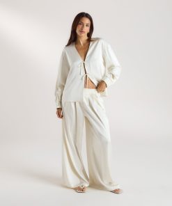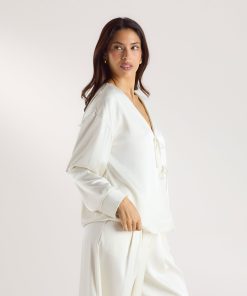Two tie fastenings to front Long-sleeved satin shirt Woven satin fabrication Plunge neckline Pleated cuffs with covered button fastenings Pleated sleeves |The Mimi Collection is a day-to-night dreamscape in satin and lace. This 14-piece collection of beautifully tonal pieces is hand-designed in Britain and made to be mixed and matched. The Mimi Long-Sleeved Satin Tie Shirt is guaranteed to bring the drama. This beautifully soft satin shirt is fastened by two ties, showing off what’s worn underneath in a subtle, yet eye-catching way.