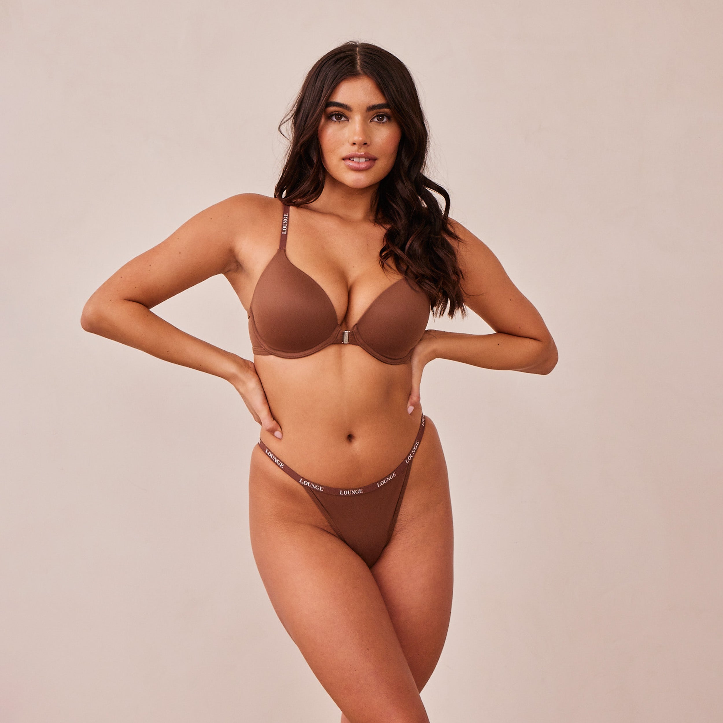 Underwired bra with foam cups Smooth brushed fabrication Lounge branded straps to bra and waist Silver front fastening clasp with debossed Lounge Silver Lounge hardware 80% Recycled Nylon, 20% Elastane Our Smooth Front Fastening T-Shirt Bra Set is designed to bring comfort into your everyday. Featuring a silver front fastening clasp, minimal branding and beautifully smooth fabric, it’s hard not to fall in love with this must-have Lounge style.