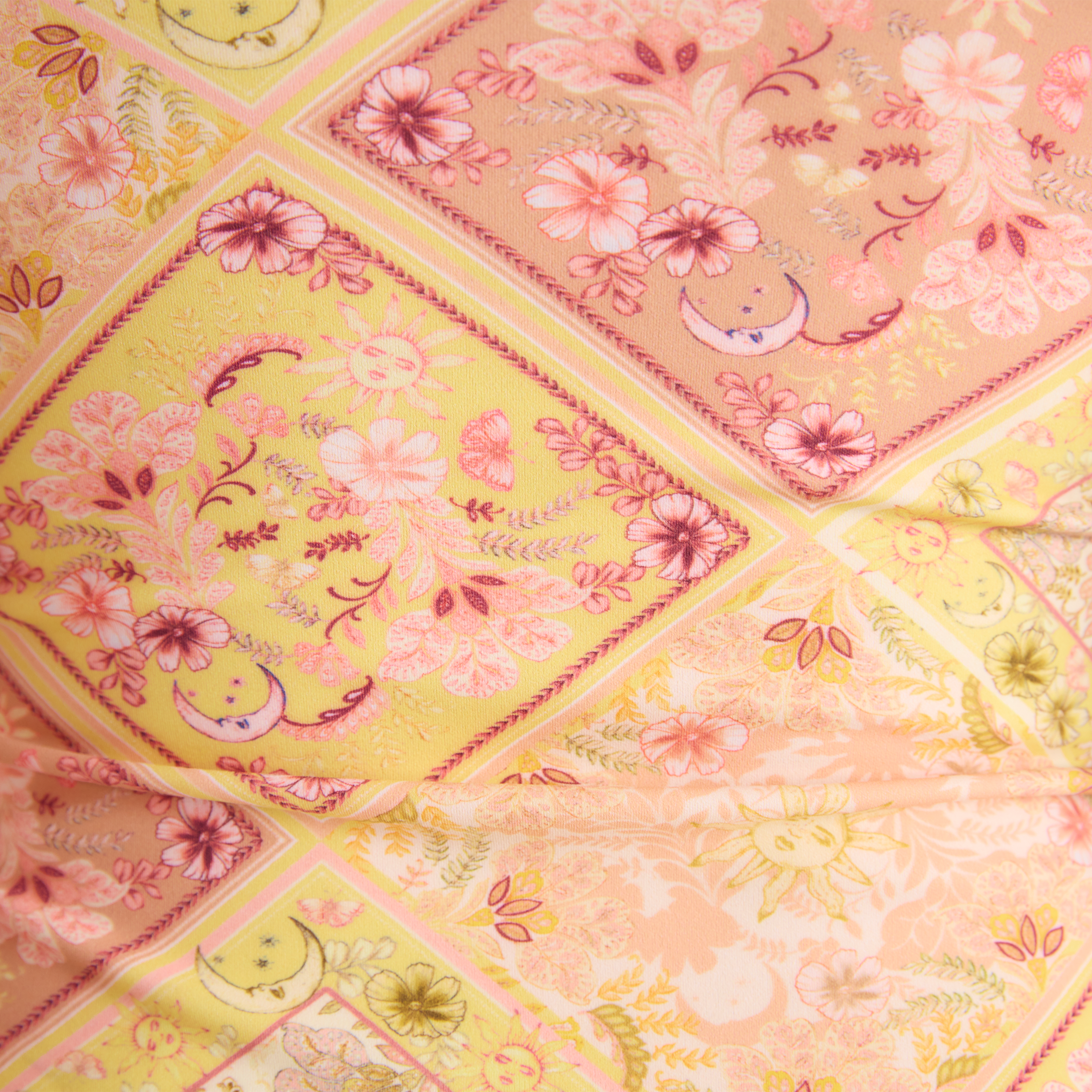 Thick, matte, sculpting fabrication Sun and moon print throughout Gathered, ruched detailing Flattering cut-out details Removable straps Non-slip silicone grip for support when worn strapless Asymmetric hammered metal rings, engraved with Lounge logo |Celestial Swim: a celebration of the sun and moon’s timeless dance across the sky. This flattering swimsuit features a bohemian-inspired print and bespoke matte gold hardware. Celestial sunbursts and crescent moons adorn this piece, making it as radiant and timeless as the sunset itself.